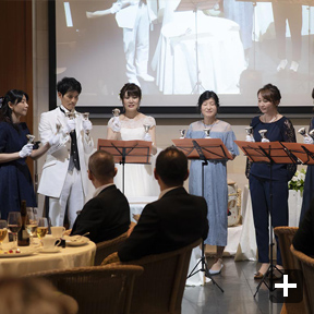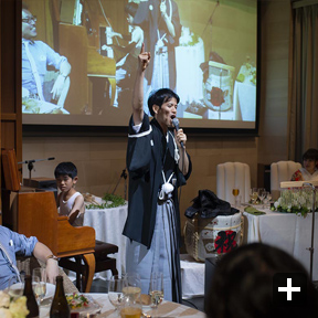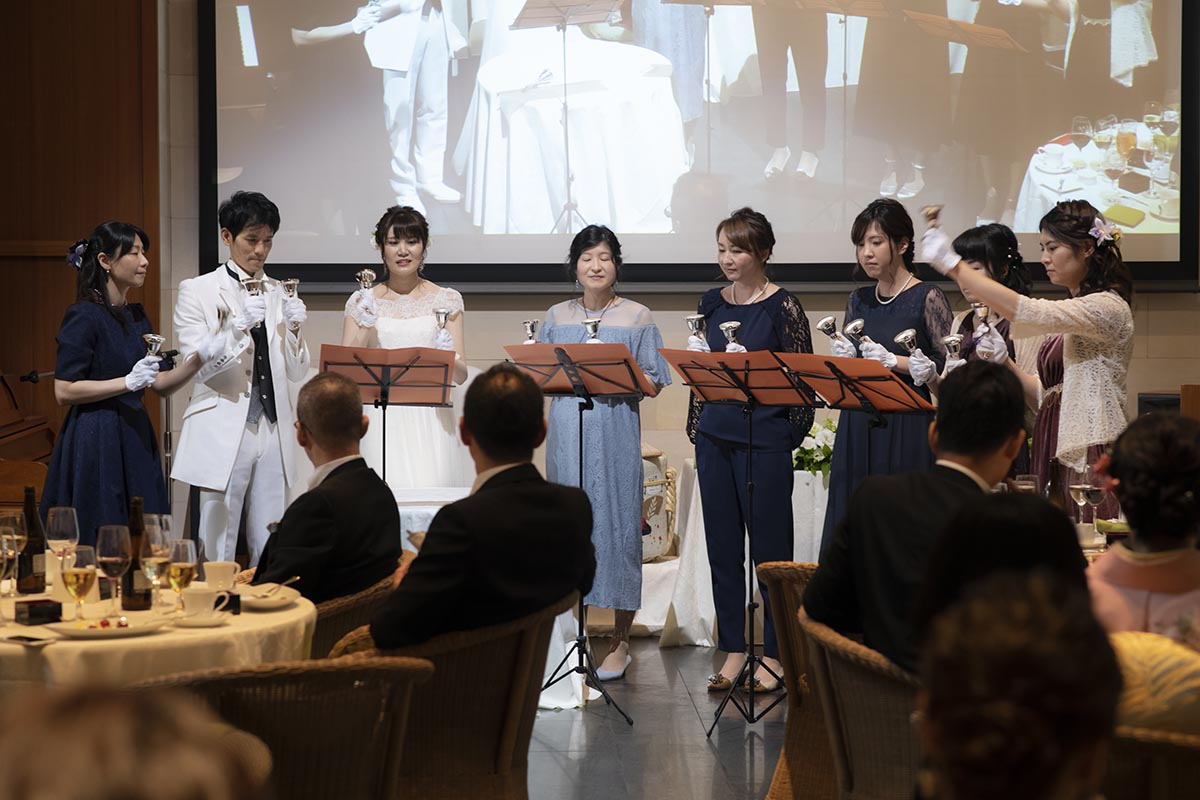 余興は、ゲストの皆さんに楽しんでもらうため、出来る限りたくさん用意しました。余興の内容は、音楽系を多くし(ピアノ、和太鼓、ギター、ハンドベルなど)、また、ゲストにお任せするでもなく、新郎新婦が単独に行うでもなく、会場みんなで楽しめるように何らかの形でゲストと新郎新婦が一緒に行うようにしました。BGMは二人の趣味で厳選し、会場で流したムービーも、オープニング、プロフィール、エンディングの3つを手作りで用意しました。引出物やプチギフトは、二人の故郷の名産品や神楽坂のものを選びました。