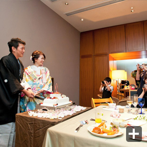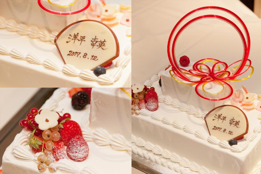 少人数での披露宴でしたが、ケーキ入刀、プロフィールムービーの上映なども行いました。ウエディングケーキ入刀はやりたかったことのうちの一つだったので、プランナーの林田さんにケーキのイメージを伝え、和婚がテーマだったので、飴細工を使って水引を作っていただくことになりました。わたしのつたないイメージを一生懸命形にしてくださり、本当にありがとうございました!おかげで素敵なケーキでファーストバイトができました☆