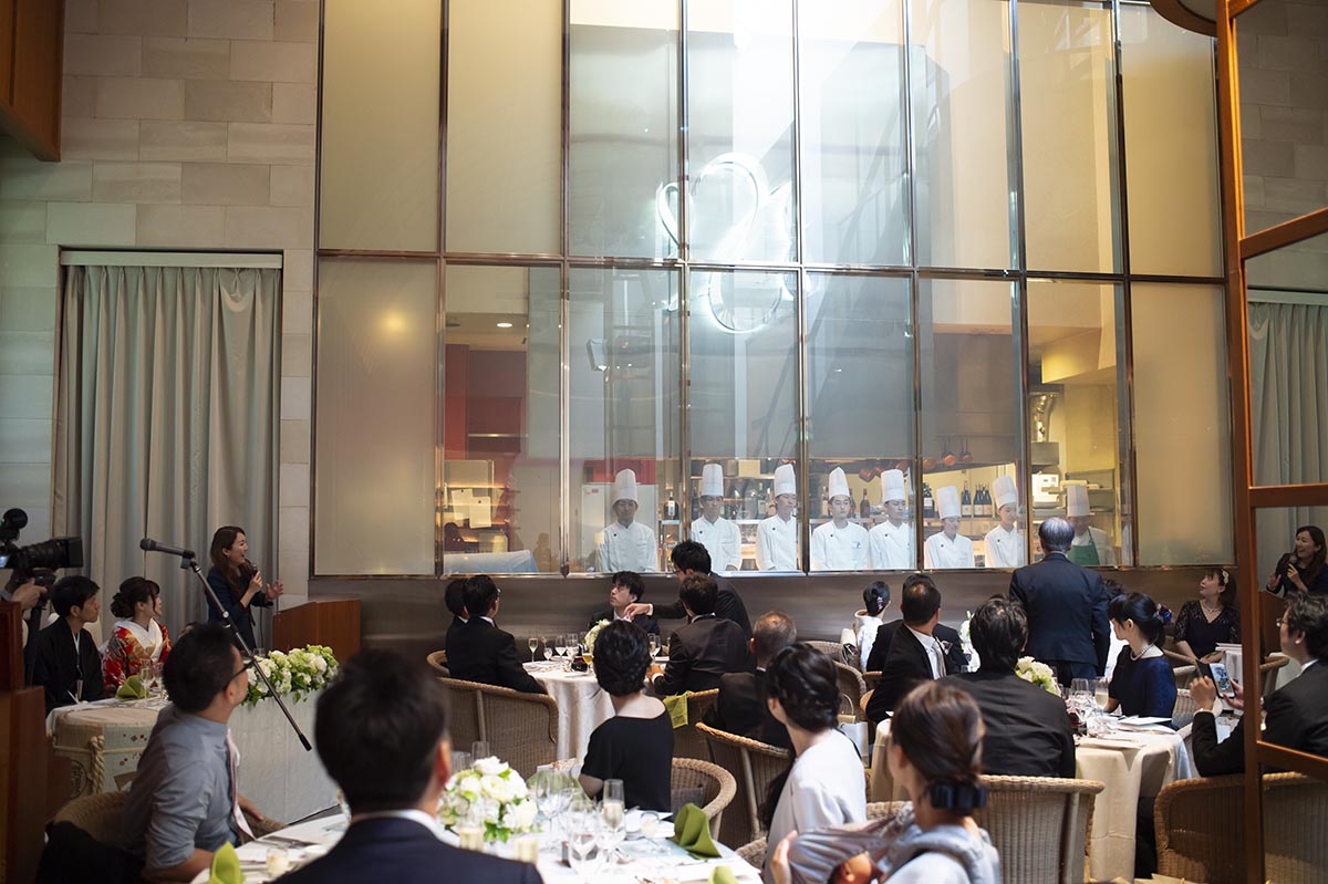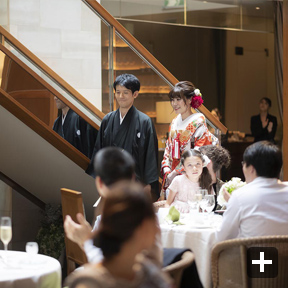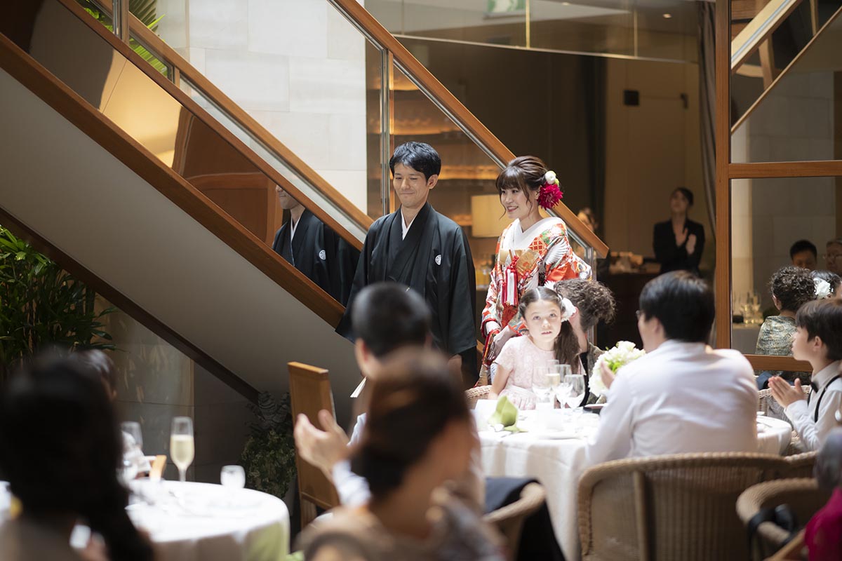 「ラリアンス」は建物の作りが特徴的で、例えば、神楽坂の通りに面した扉を入ってすぐのエスカレーター、メインダイニングは吹き抜けの高い天井に自然光の入る天窓と長い階段、2階のバーやチャペルとしても利用可能なスペースなど、一般的な披露宴会場のイメージである催事場とは一味違った仕掛けがあり、それらを活用して演出を工夫することができたことも楽しかったです。特に、吹き抜けの階段を利用した新婦の再入場はとても印象的なものとなりました。