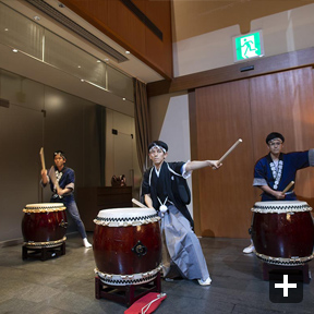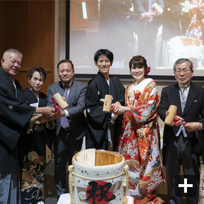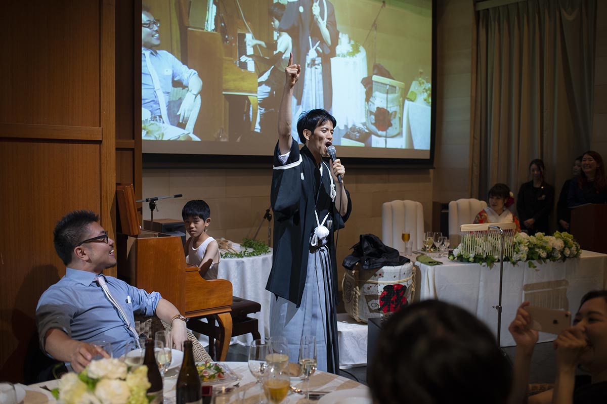 余興は、ゲストの皆さんに楽しんでもらうため、出来る限りたくさん用意しました。余興の内容は、音楽系を多くし(ピアノ、和太鼓、ギター、ハンドベルなど)、また、ゲストにお任せするでもなく、新郎新婦が単独に行うでもなく、会場みんなで楽しめるように何らかの形でゲストと新郎新婦が一緒に行うようにしました。BGMは二人の趣味で厳選し、会場で流したムービーも、オープニング、プロフィール、エンディングの3つを手作りで用意しました。引出物やプチギフトは、二人の故郷の名産品や神楽坂のものを選びました。